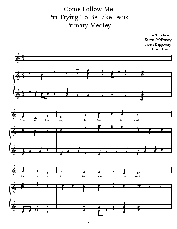 A simple but nice medley of two well-known songs. Come Follow me is first, then Im Trying to Be Like Jesus, which has a repeat if two verses will be sung. Then a tag ending with a short Come Follow Me motif as the children hold the last note finishes it off.