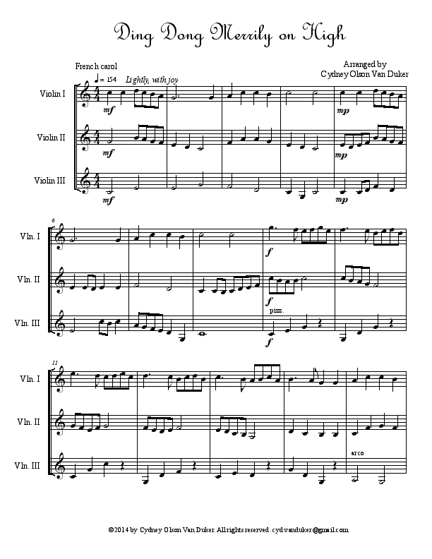 This joyous French carol dates back to the 1500s. This string arrangement moves right along with all the instruments trading the melody back and forth. Listen for the Baroque influence. I Heard the Bells on Christmas Day is woven into the third verse. This is a really fun song to play. Have fun with it! Arranged for three violins, or two violins and cello, or violin, viola, and cello.