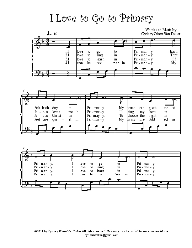 I Love to go to Primary was written mostly for the younger kids. The words are easy and repetitive. It can also be used as a get the wiggles out song. The last verse is about being reverent.